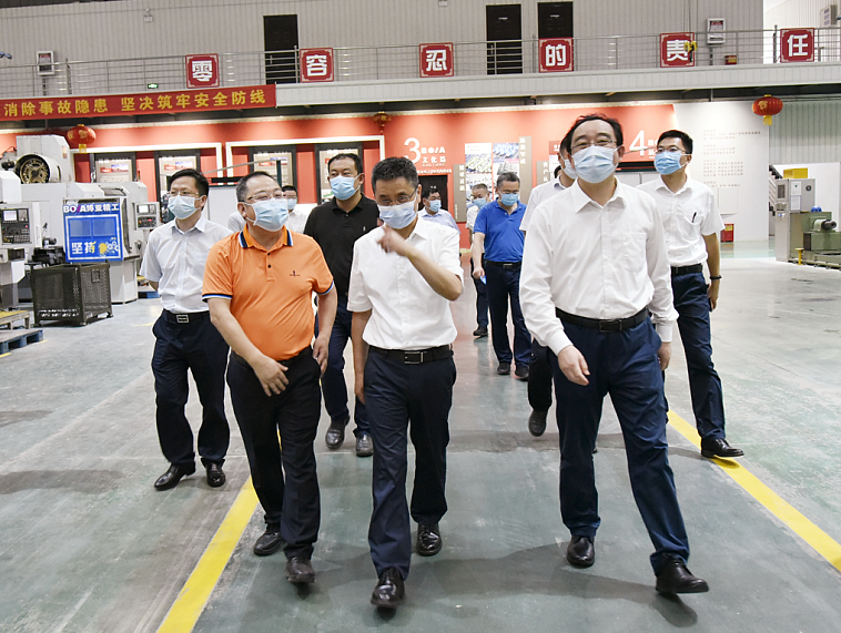 王市長一行先后走進(jìn)特裝生產(chǎn)車間、再制造及精沖機(jī)維修車間(A1車間),實(shí)地查看一線疫情防控和生產(chǎn)經(jīng)營情況,詢問了解公司發(fā)展?fàn)顩r,并在A1車間舉行座談,詳細(xì)聽取李總的工作匯報。