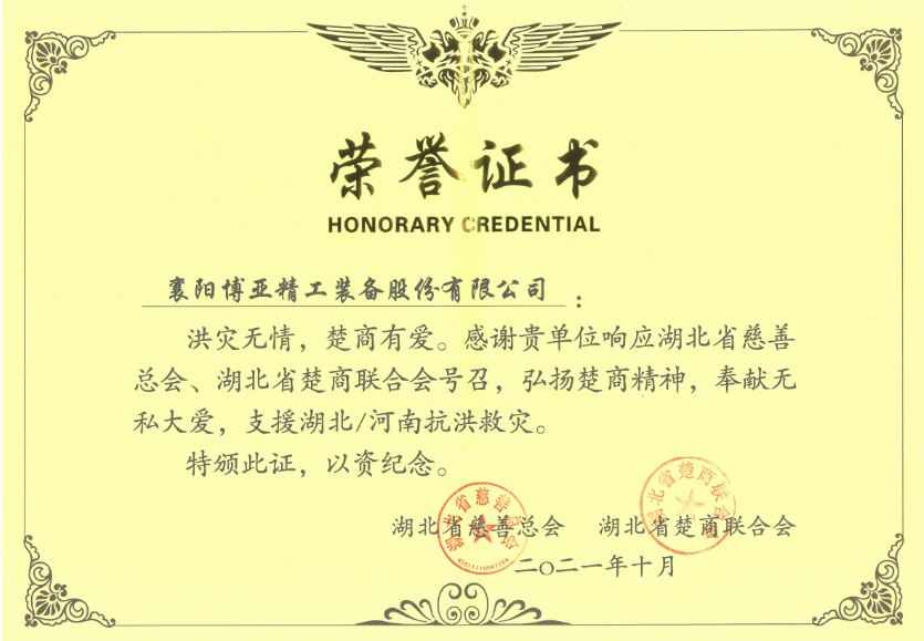 洪災(zāi)無(wú)情人有情,守望相助心連心。今年入汛以來(lái),河南、湖北等地相繼遭遇極端強(qiáng)降雨,給當(dāng)?shù)卦斐蓢?yán)重洪澇災(zāi)害,給人民群眾生命財(cái)產(chǎn)安全帶來(lái)極大危害。每當(dāng)此危急時(shí)刻,博亞公司都能積極響應(yīng)上級(jí)號(hào)召,展現(xiàn)企業(yè)責(zé)任擔(dān)當(dāng),為受災(zāi)地區(qū)捐款捐物。截止目前,公司先后為河南暴雨洪澇災(zāi)害捐款30萬(wàn)元、為湖北宜城抗洪救災(zāi)捐款5萬(wàn)元。近日,因博亞公司積極支援湖北、河南抗洪救災(zāi)被湖北省慈善總會(huì)、湖北省楚商聯(lián)合會(huì)聯(lián)合授予榮譽(yù)證書(shū)。